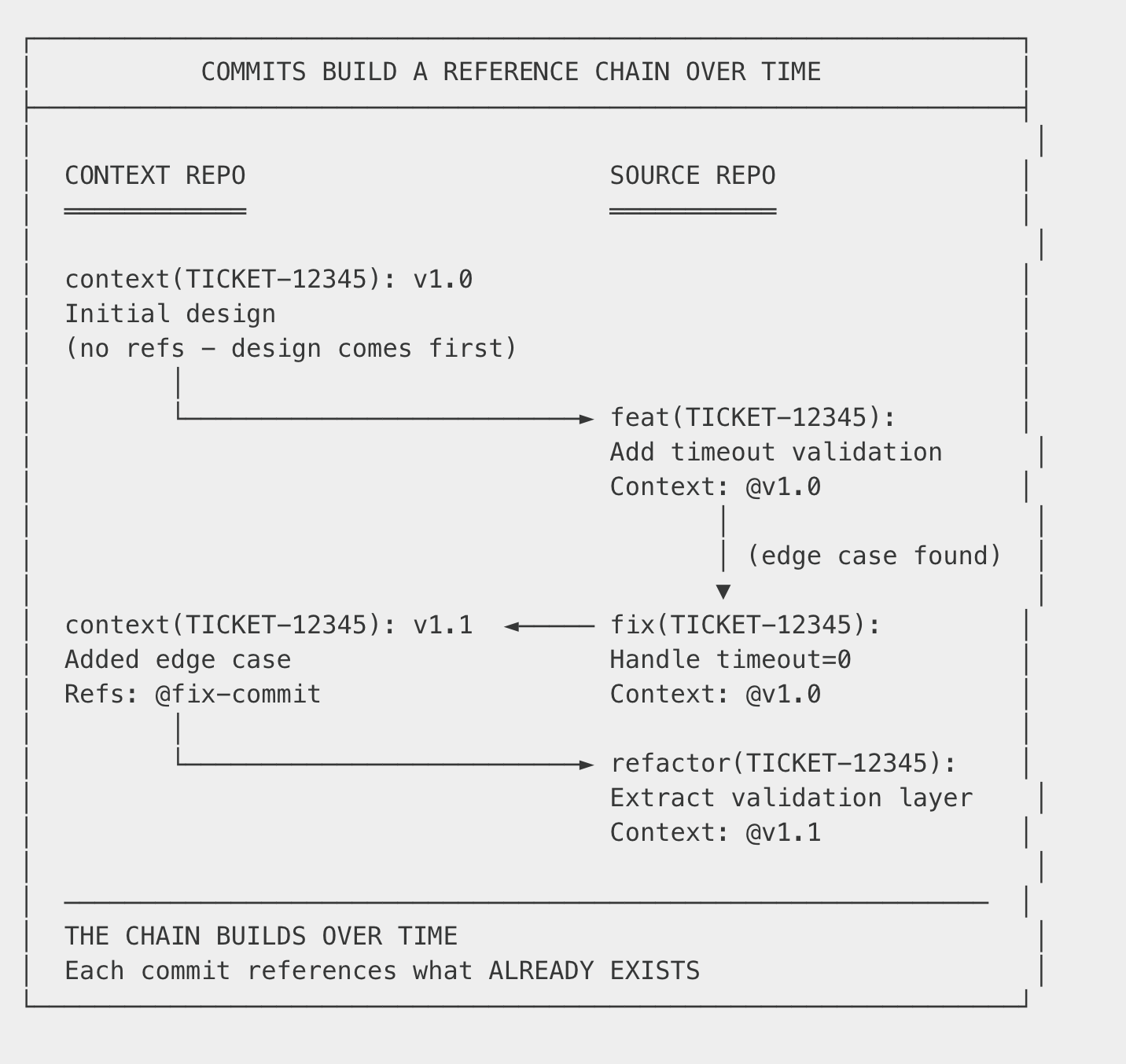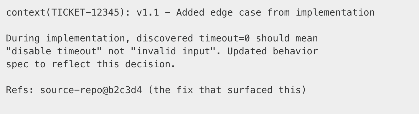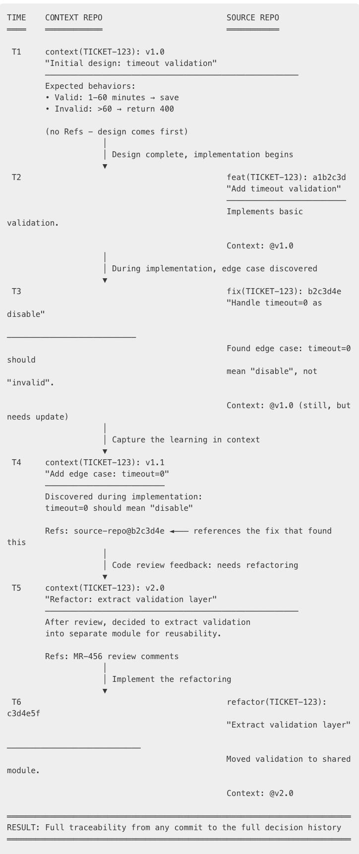 v1.0→v1.1→v2.0shows the context evolved. Major version = significant design change. Minor = refinements during implementation.Git blame works in both directions. “Why does this code handle timeout=0 specially?” → check the