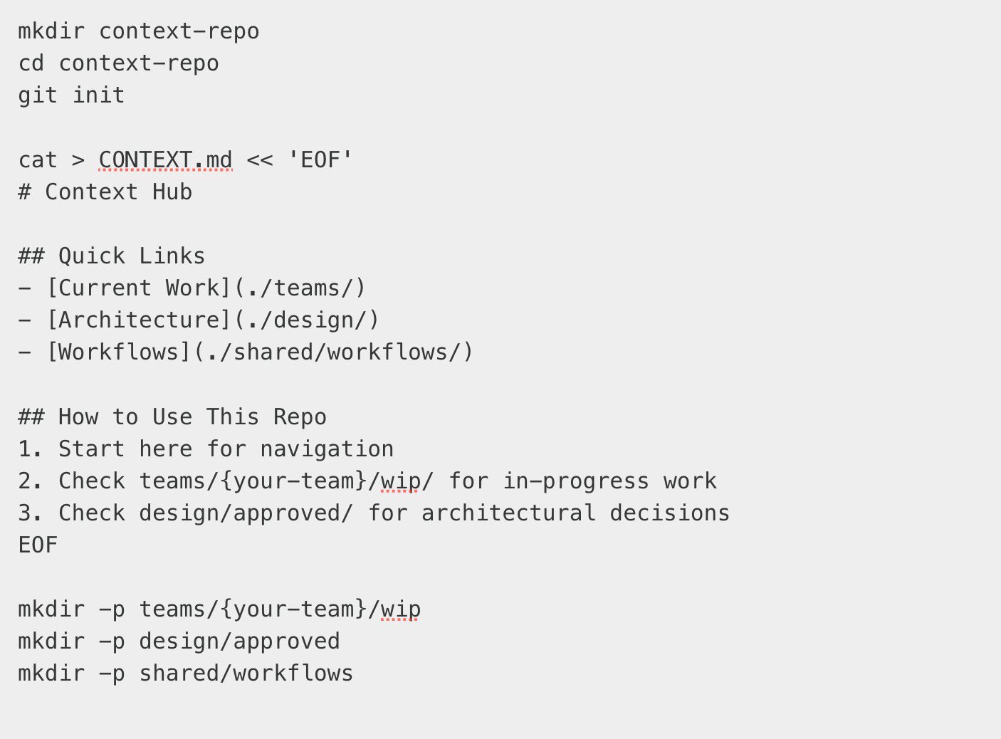 My team created a dedicated Git repository—not for code, but for context. Here’s what it contains: