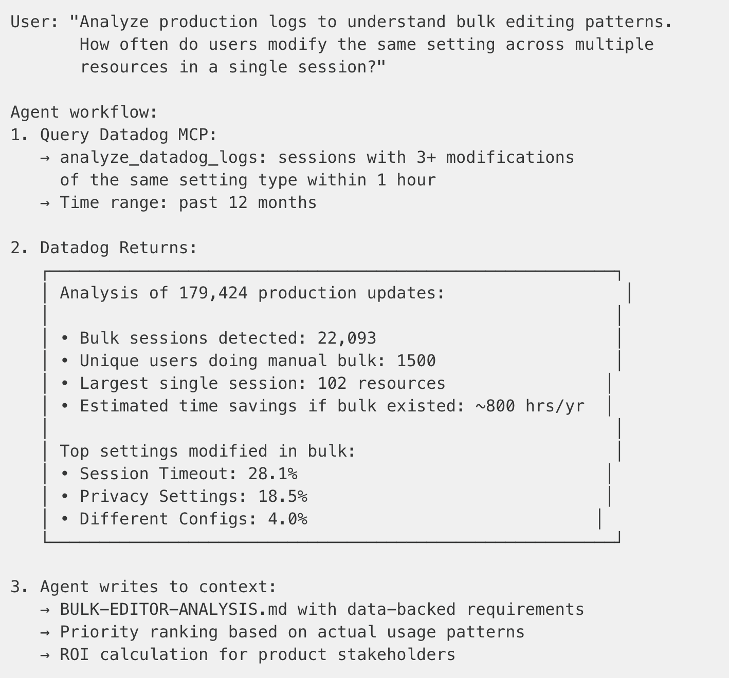 We needed to design a bulk settings editor. Instead of guessing what users want, we asked the agent to analyze production data: