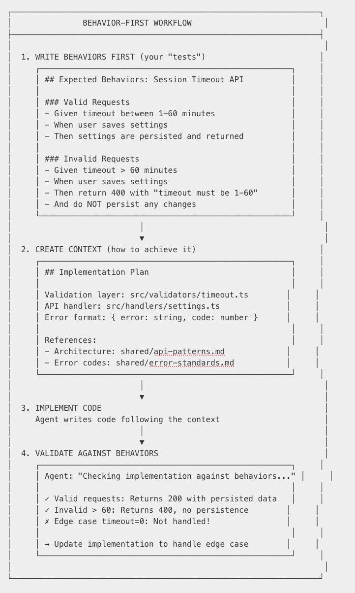 When edge cases emerge during implementation, we add them to the behavior doc—not buried in test files. The context grows. The next developer (or AI agent) sees the full picture.