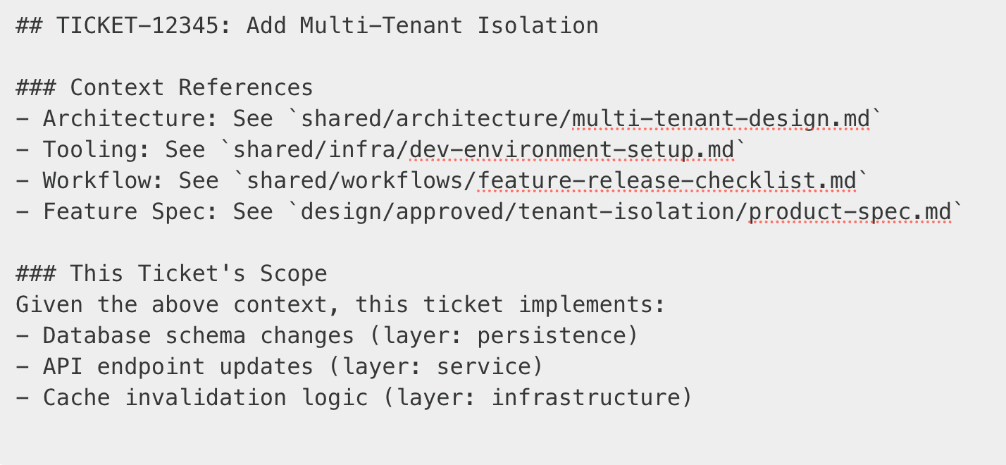 The AI agent can traverse these references. It doesn’t need me to copy-paste the architecture into every ticket. It follows the graph.