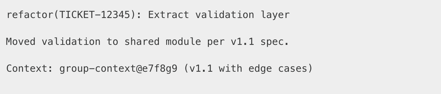 Every coding session generates insights. Those insights update the context. The updated context informs the next session. We commit context changes alongside code changes—same branch name, parallel evolution.